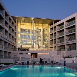 Os acessos aos pisos dos quartos fazem-se através de elevadores panorâmicos que se situam no átrio de pé direito múltiplo, permitindo uma visualização da paisagem a poente, ao mesmo tempo que contribuem para uma animação cenográfica dos espaços comuns do edifício.