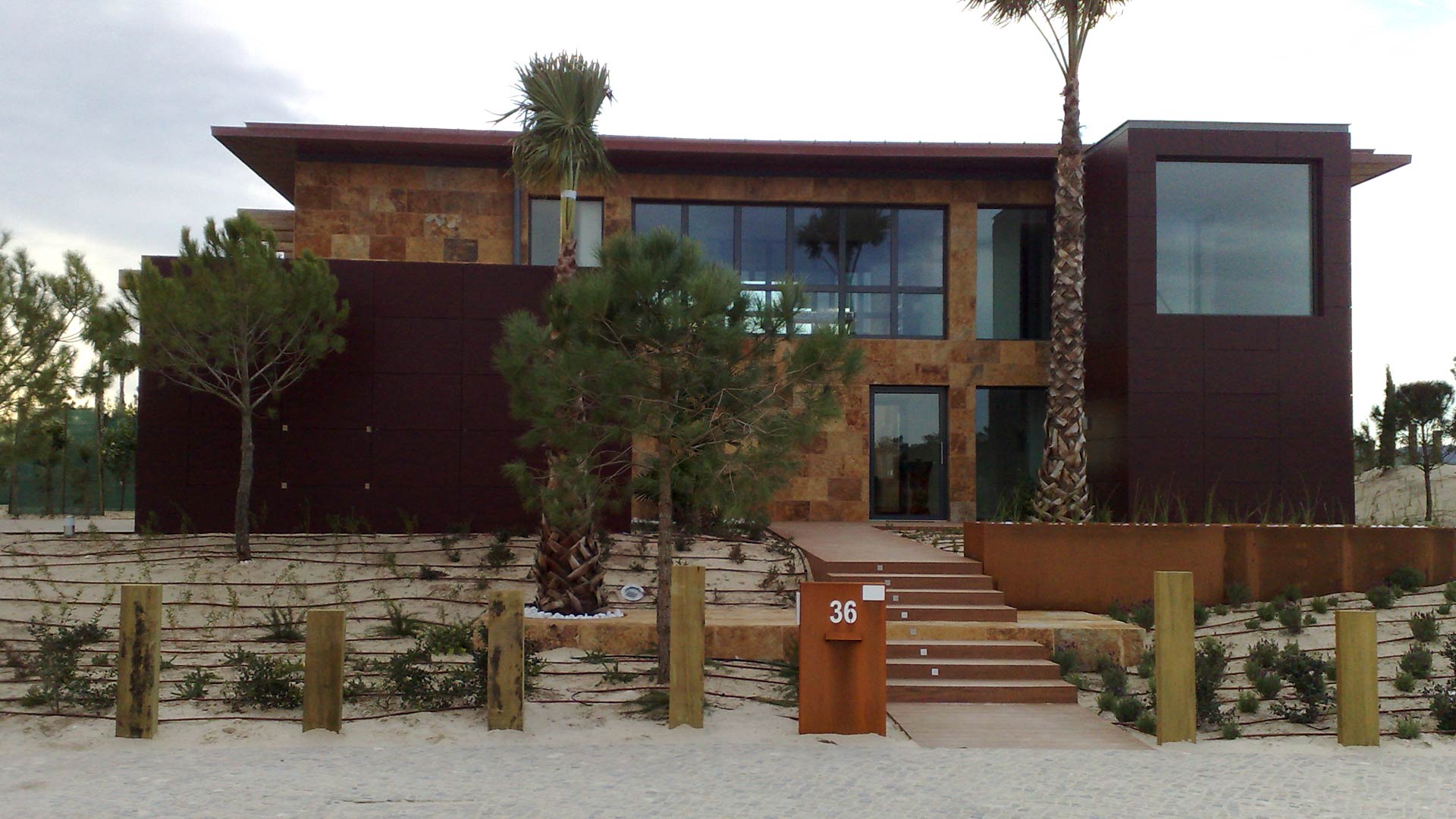 Pensar moradias para um ambiente natural como é o caso da Península de Tróia levou-nos, desde logo, a pensar numa solução de grande abertura do interior com o espaço envolvente, em que a presença do mar e do céu, da praia e do verde, determinariam a organização dos espaços da casa.