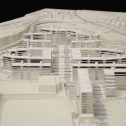 Morfologia de preenchimento do vazio da antiga pedreira, estruturada a partir de um grande eixo alameda, que estabelece a ligação entre o edifício existente da piscina municipal e o conjunto edificado que faz o remate da zona mais alta a norte, buscando-se deste modo a ideia de um grande edifício composto por vários corpos articulados entre si ao longo deste eixo e inseridos através das suas cotas máximas ajardinadas, na massa verde do Parque de Monsanto.